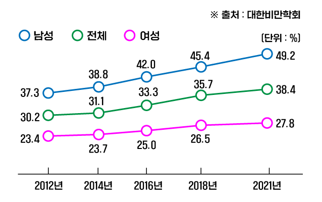 대한민국은 살찌고 있습니다. 국내 성인 3명중 1명은 비만인것으로 나오고 있습니다. 연령과 관계없이 비만율이 빠르게 늘어 막대한 사회적 비용도 발생하는 시점에서 이미 그 관심은 하늘을 찌를만큼 관련된 제품이나 치료법 등이 판을 치고 있습니다. 비만과의 전쟁이라고 볼 수 있습니다.